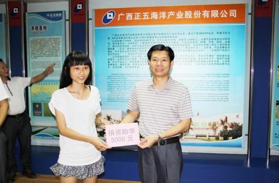 2013年8月29日上午,北海市銀海區(qū)委宣傳部、區(qū)團(tuán)委、建設(shè)局,銀灘鎮(zhèn)黨委、社會(huì)保障服務(wù)中心、鎮(zhèn)團(tuán)委在正五公司為家住銀灘鎮(zhèn)北背嶺村的高考生林慶真舉行了一場(chǎng)簡(jiǎn)潔而隆重的捐資助學(xué)儀式。董事長(zhǎng)黃禮雄代表正五公司向林慶真捐款5000元,銀灘鎮(zhèn)各界也向林慶真捐款5000元。